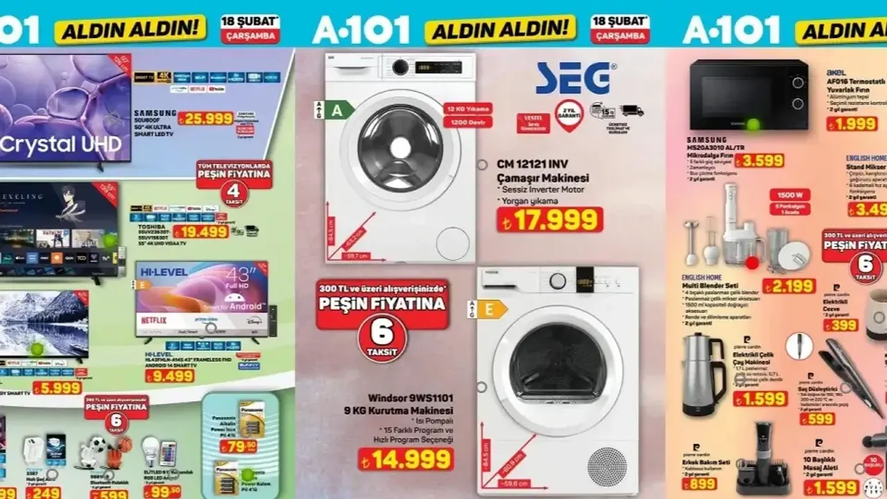 A101 aktüel afiş 18 Şubat 2026 kapsamında elektronik, beyaz eşya ve küçük ev aletleri öne çıktı. Katalogda yer alan bazı dikkat çekici ürünler ve fiyatları şu şekilde duyuruldu: