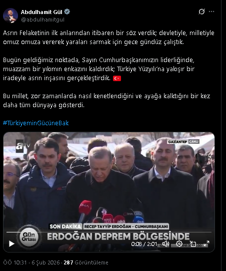 Sosyal medya hesabı üzerinden 6 Şubat Depremlerinin yıldönümünde paylaşımda bulunan AK Parti Grup Başkanvekili Abdulhamit Gül, “Asrın Felaketinin ilk anlarından itibaren bir söz verdik; devletiyle, milletiyle omuz omuza vererek yaraları sarmak için gece gündüz çalıştık. Bugün geldiğimiz noktada, Sayın Cumhurbaşkanımızın liderliğinde, muazzam bir yıkımın enkazını kaldırdık; Türkiye Yüzyılı’na yakışır bir iradeyle asrın inşasını gerçekleştirdik. Bu millet, zor zamanlarda nasıl kenetlendiğini ve ayağa kalktığını bir kez daha tüm dünyaya gösterdi” ifadelerini kullandı.