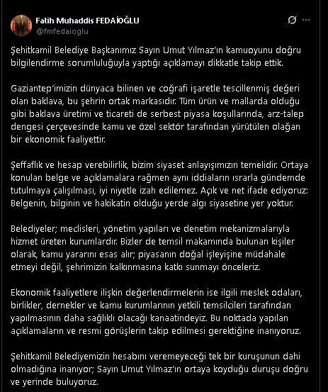 Şehitkamil Belediye Başkanı Umut Yılmaz’a tam destek veren Fedaioğlu, “Şehitkamil Belediye Başkanımız Sayın Umut Yılmaz’ın kamuoyunu doğru bilgilendirme sorumluluğuyla yaptığı açıklamayı dikkatle takip ettik. Gaziantep’imizin dünyaca bilinen ve coğrafi işaretle tescillenmiş değeri olan baklava, bu şehrin ortak markasıdır. Tüm ürün ve mallarda olduğu gibi baklava üretimi ve ticareti de serbest piyasa koşullarında, arz-talep dengesi çerçevesinde kamu ve özel sektör tarafından yürütülen olağan bir ekonomik faaliyettir.”