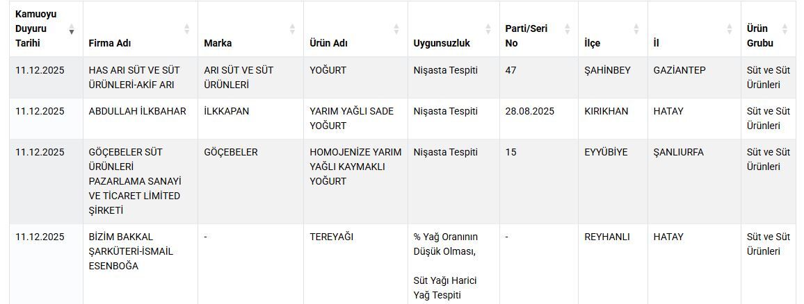 Tarım ve Orman Bakanlığı tağşiş ve taklit gıda üretimi yapan firmaları ifşa etmeye devam ediyor. Bakanlık yayımladığı ilgili son listede Gaziantep’te süt ve süt ürünleri üretimi yapan bir firma yer aldı. Bakanlığın paylaştığı listeye göre Gaziantep’te süt ve süt ürünleri üreten firmanın ürettiği yoğurtta nişasta tespit edildi. Listede Gaziantep’in yanı sıra Şanlıurfa ve Hatay’dan da firmalar yer aldı.