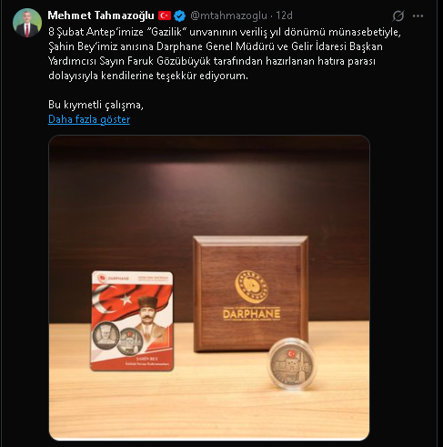 Konuya ilişkin sosyal medya hesabı üzerinden açıklamalarda bulunan Şahinbey Belediye Başkanı Mehmet Tahmazoğlu, “8 Şubat Antep’imize “Gazilik” unvanının veriliş yıl dönümü münasebetiyle, Şahin Bey’imiz anısına Darphane Genel Müdürü ve Gelir İdaresi Başkan Yardımcısı Sayın Faruk Gözübüyük tarafından hazırlanan hatıra parası dolayısıyla kendilerine teşekkür ediyorum. Bu kıymetli çalışma, Antep savunmasının sarsılmaz iradesini ve milletimizin istiklal uğruna ortaya koyduğu destansı mücadeleyi güçlü bir şekilde simgelemektedir. Bu vesileyle, başta Şahin Bey olmak üzere vatan uğruna can veren tüm kahramanlarımızı rahmet, minnet ve şükranla yâd ediyorum” ifadelerini kullandı.