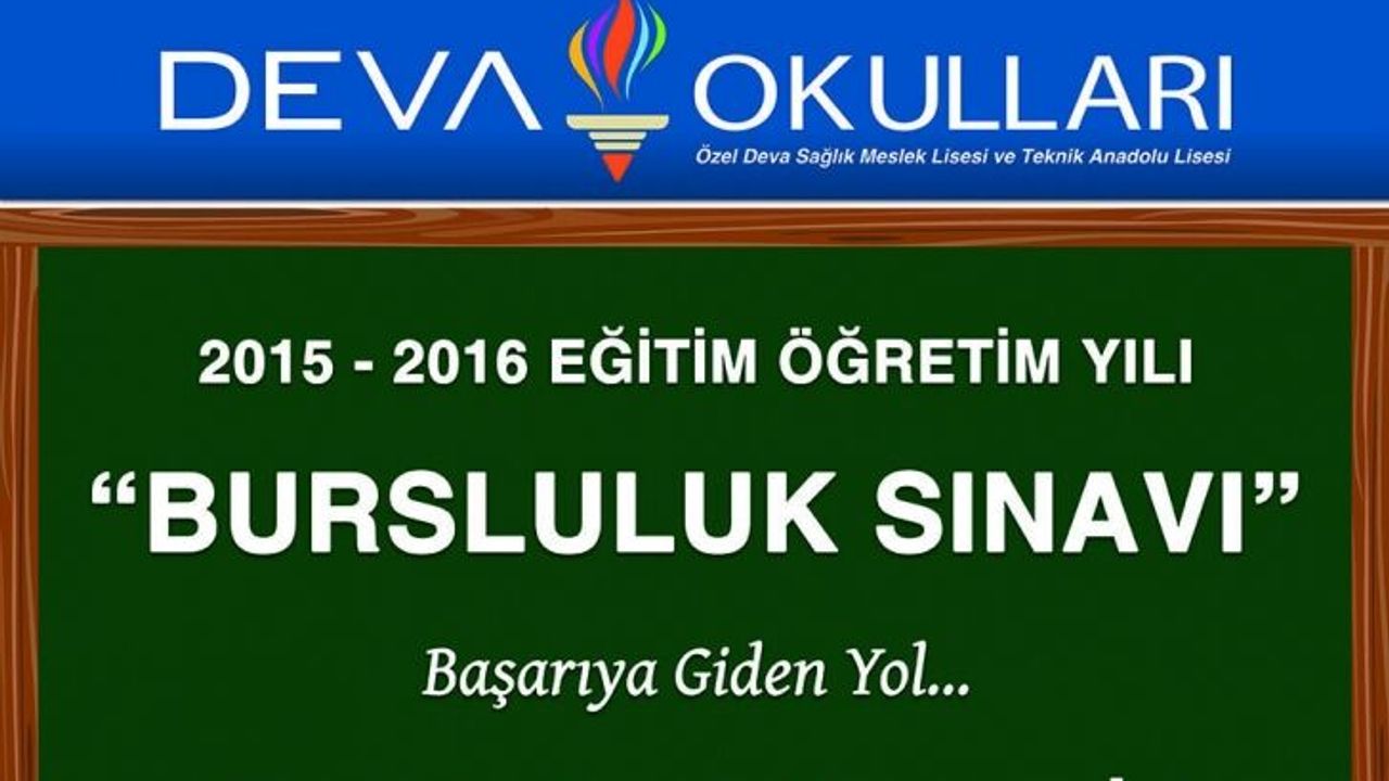 Özel Deva Okulları;2015-2016 Eğitim Öğretim yılı 4,5,6,7,8 ve 9.sınıflarda bursluluk sınav başvurularını 2 Mart -25 Mart arası olarak başlatmış olup sınav 28 – 29 Mart 2015 ( Cumartesi -Pazar) tarihinde yapılacaktır. Sınav sonucunda ise öğrencinin göstermiş olduğu başarıya göre % 25 , % 50 , %75 ve % 100 oranında burs vereceğini ilan edilmiştir.