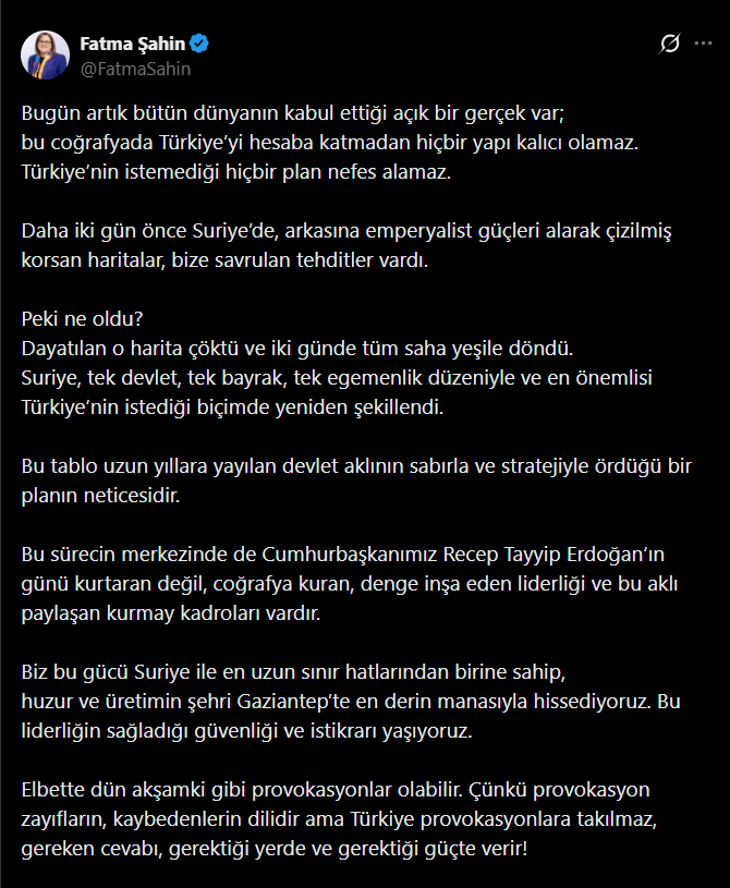 Gaziantep Büyükşehir Belediye Başkanı Fatma Şahin sosyal medya hesabı üzerinden sert açıklamalarda bulundu. Şahin, “Bugün artık bütün dünyanın kabul ettiği açık bir gerçek var; bu coğrafyada Türkiye’yi hesaba katmadan hiçbir yapı kalıcı olamaz. Türkiye’nin istemediği hiçbir plan nefes alamaz. Daha iki gün önce Suriye’de, arkasına emperyalist güçleri alarak çizilmiş korsan haritalar, bize savrulan tehditler vardı.”