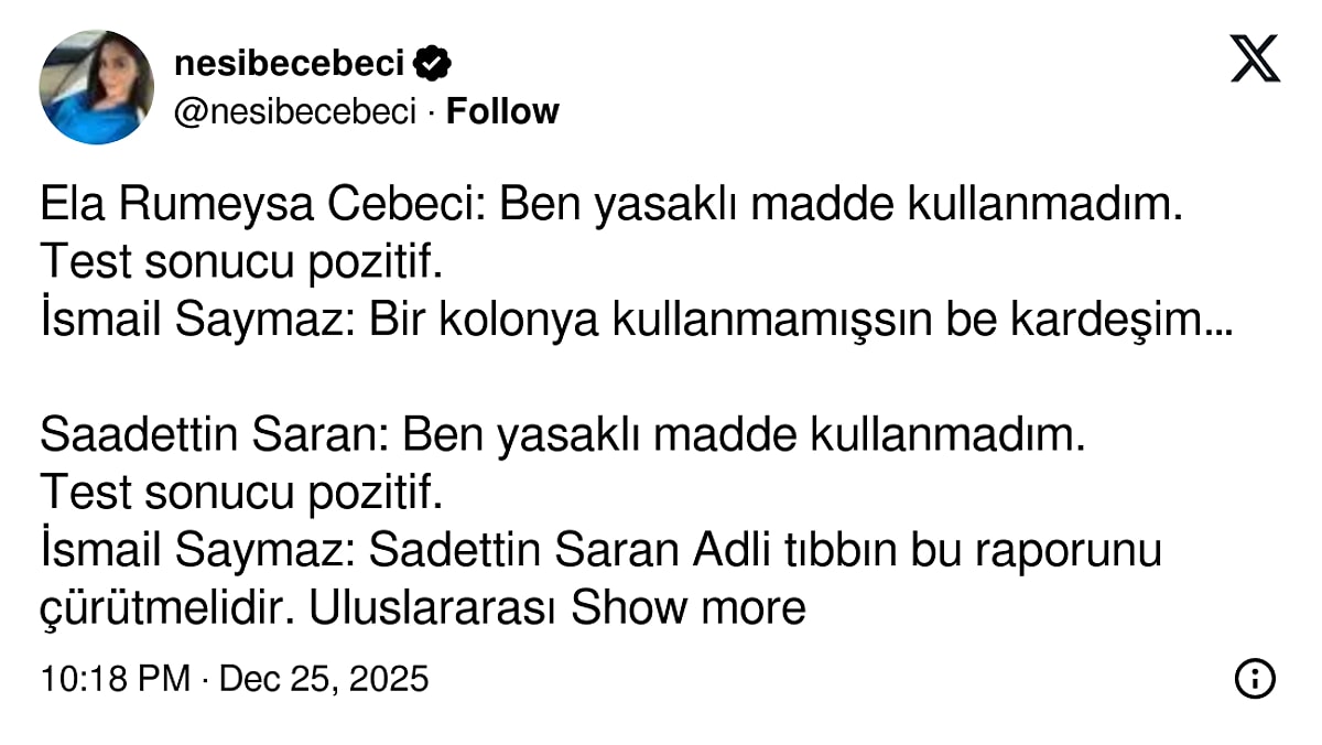 Nesibe Cebeci, bir diğer paylaşımında gazeteci İsmail Saymaz’ın, Ela Rümeysa Cebeci ile Sadettin Saran hakkında çıkan test sonuçlarını farklı üsluplarla değerlendirdiğini savundu. Aynı tür test sonuçları karşısında kullanılan dilin değiştiğini öne süren Cebeci, bu durumun adil olmadığını ifade etti.