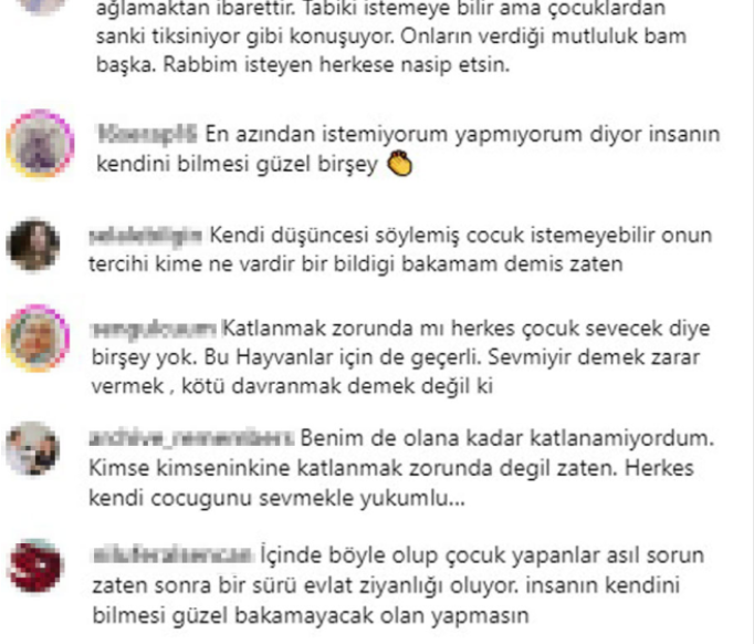 İrem Derici'nin sözleri kısa sürede sosyal medyada gündem olurken yorumlar da beraberinde geldi. Derici'ye destek mesajlarının yanı sıra "Sen bu dünyaya yetiyorsun zaten çocuk yapma" yorumları geldi.