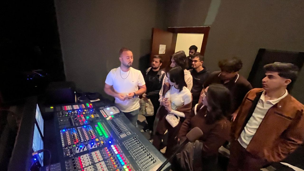 Merkezde bulunan profesyonel ses sistemlerini teknik ekip eşliğinde inceleyerek sistemlerin kurulum, bağlantı ve yönetim süreçlerini gözlemleyen öğrenciler; ayrıca sahne ses sistemlerinin çalışma prensiplerini, sinyal akışını, mikser kullanımını ve akustik uygulamaları yerinde deneyimleme fırsatı buldu.