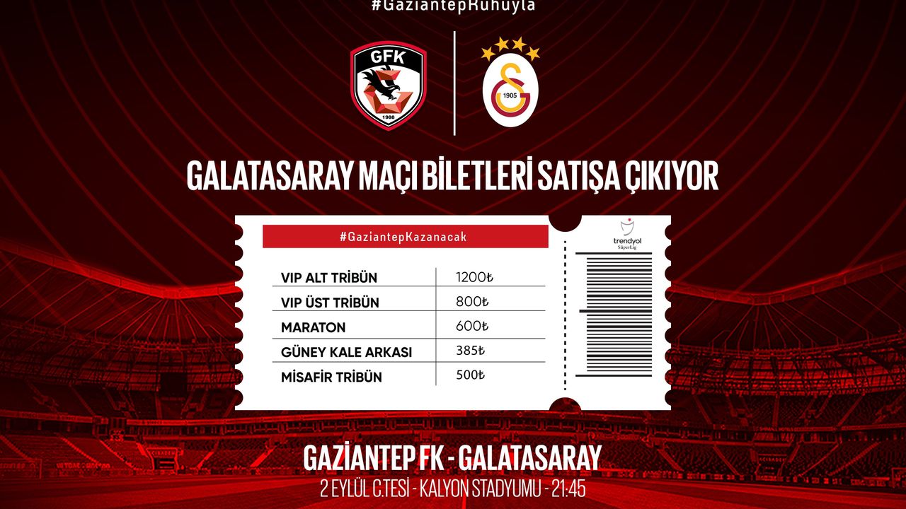 Gaziantep Futbol Kulübü, Trendyol Süper Lig'in 4. haftasında Galatasaray'ı konuk edecek. Gaziantep Kalyon Stadı'nda 2 Eylül Cumartesi günü saat 21.45'de oynanacak maçın biletleri satışa çıktı. Bilet fiyatları 385 ile bin 200 TL arasında değişirken, konuk Galatasaray taraftarlarına ayrılan misafir tribün bilet fiyatları ise 500 TL'den satışa sunuldu.