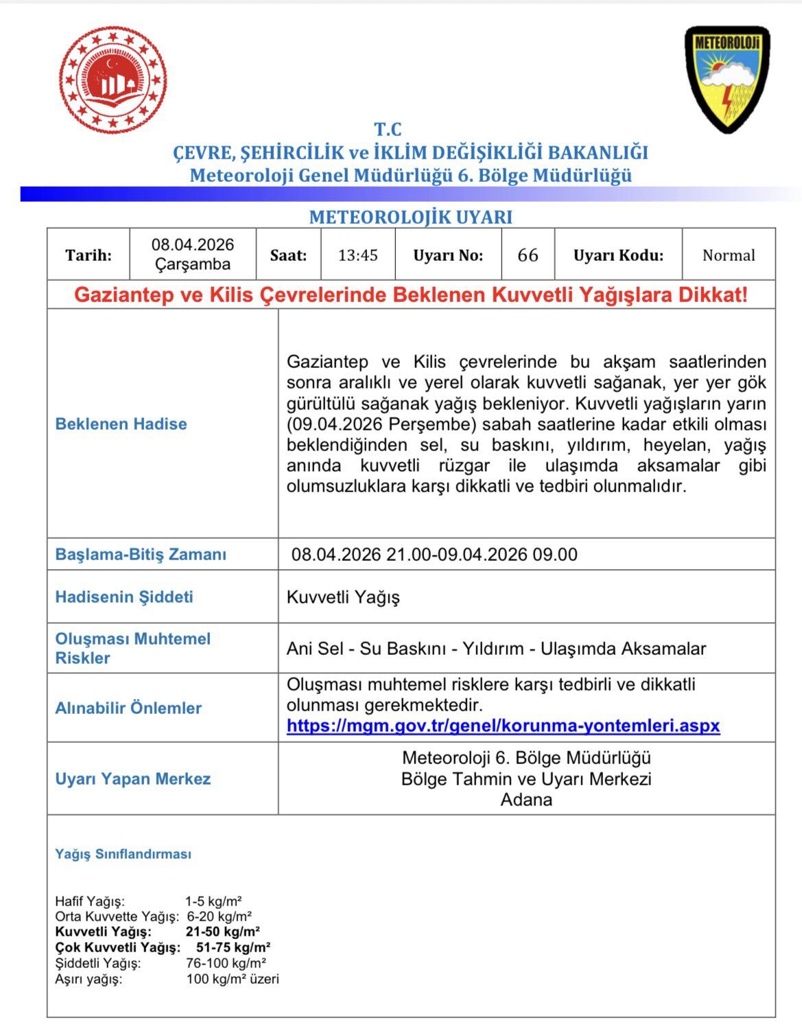 Meteoroloji Genel Müdürlüğünden yapılan uyarıda, “Gaziantep ve Kilis çevrelerinde bu akşam saatlerinde sonra aralıklı ve yerel olarak kuvvetli sağanak, yer yer gök gürültülü sağanak yağış bekleniyor. Kuvvetli yağışların yarın sabah saatlerine kadar etkili olması beklendiğinden sel, su baskını, yıldırım, heyelan, yağış anında kuvvetli rüzgar ile ulaşımda aksamalar gibi olumsuzluklara karşı dikkatli olunmalıdır” ifadeleri yer aldı.
