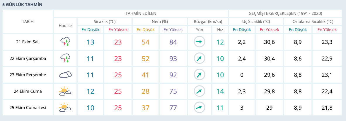 Meteoroloji Genel Müdürlüğü’nün hava durumu tahminlerine göre ülkenin genelinde yer yer çok bulutlu, yağmur ve sağanak yağışlı olacak. Gaziantep’te ise yarından itibaren sağanak yağış olması bekleniyor. Meteoroloji Genel Müdürlüğü verilerine göre Gaziantep’te 21 Ekim Salı gününden itibaren yağışlı hava hakim olacak. Yağışlı hava 22 Ekim Çarşamba gününde de etkisini sürdürecek. Kentte hafta boyunca en düşük sıcaklık 11°C’ye kadar düşmesi bekleniyor. Meteoroloji Genel Müdürlüğü’nün Gaziantep için beş günlük hava durumu tahmini şu şekilde;