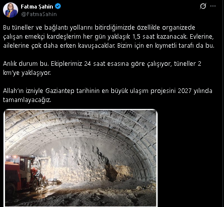 Sosyal medya hesabı üzerinden açıklamalarda bulunan Şahin, Dülük Tünellerinde gelinen noktayı anlattı. Şahin, “Bu tüneller ve bağlantı yollarını bitirdiğimizde özellikle organizede çalışan emekçi kardeşlerim her gün yaklaşık 1,5 saat kazanacak. Evlerine, ailelerine çok daha erken kavuşacaklar. Bizim için en kıymetli tarafı da bu. Anlık durum bu. Ekiplerimiz 24 saat esasına göre çalışıyor, tüneller 2 km’ye yaklaşıyor. Allah’ın izniyle Gaziantep tarihinin en büyük ulaşım projesini 2027 yılında tamamlayacağız” ifadelerini kullandı.