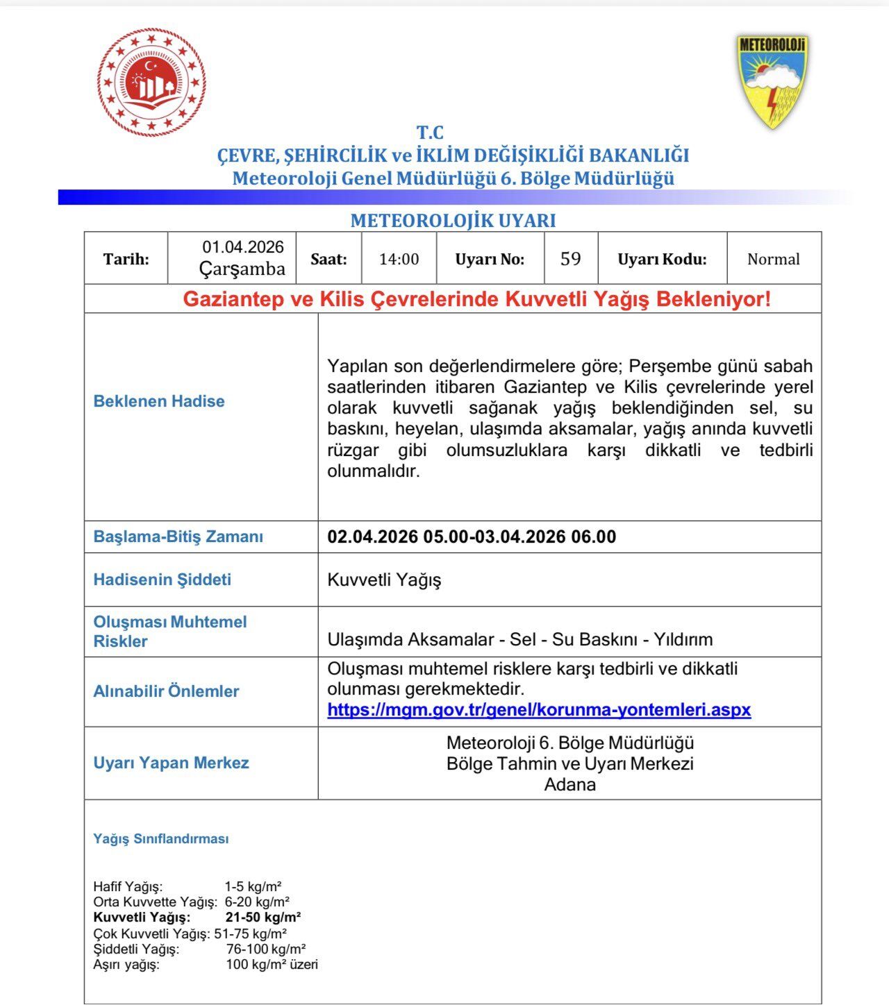 Konuya ilişkin Gaziantep Valiliğinden yapılan duyuruda, “Yapılan son değerlendirmelere göre, Perşembe günü sabah saatlerinden itibaren Gaziantep ve Kilis çevrelerinde yerel olarak kuvvetli sağanak yağış beklenildiğinden sel, su baskını, heyelan, ulaşımda aksamalar, yağış anında kuvvetli rüzgar gibi olumsuzluklara karşı dikkatli ve tedbirli olunmalıdır” denildi.