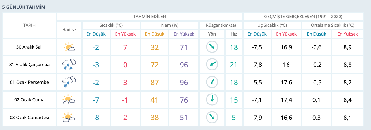 Türkiye genelinde etkili olan kar yağışı Gaziantep’te de etkisini gösterdi. Yıllın ilk karı yağışını gören Gazianteplileri daha yoğun kar yağışı ve soğuk havalar bekliyor. Dün gece saatlerinde etkili olmaya başlayan kar yağışı 31 Aralık Çarşamba günü ve 1 Ocak Perşembe günü devam edecek. Kar yağışının 2 gün boyunca yağmurun etkili olması tahmin ediliyor. Kentte hafta boyunca en düşük sıcaklık -8°C en yüksek ise 7°C olacak. Meteoroloji Genel Müdürlüğü’nün Gaziantep için beş günlük hava durumu tahmini şöyle;