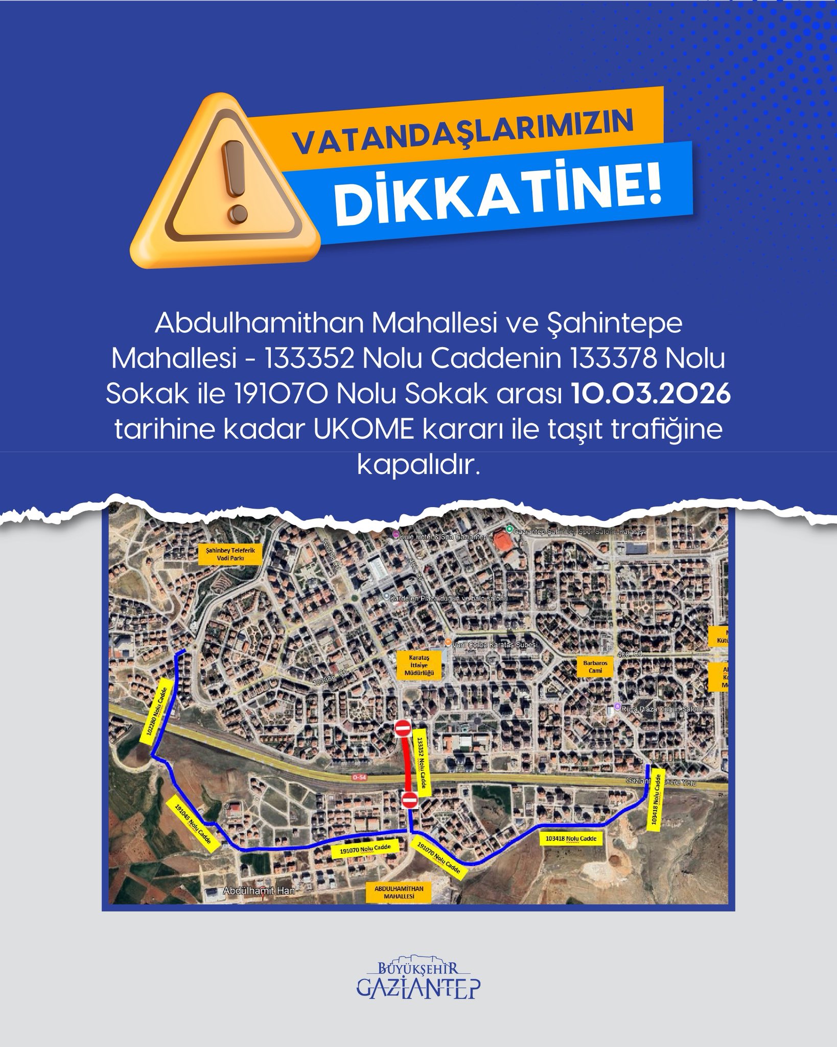 Gaziantep Büyükşehir Belediyesi’nden yapılan duyuruda, “Abdulhamithan Mahallesi ve Şahintepe Mahallesi, 133352 nolu Caddenin 133378 nolu sokak ile 191070 nolu sokak arası 10 Mart 2026 tarihine kadar UKOME kararı ile taşıt trafiğine kapalıdır” denildi.