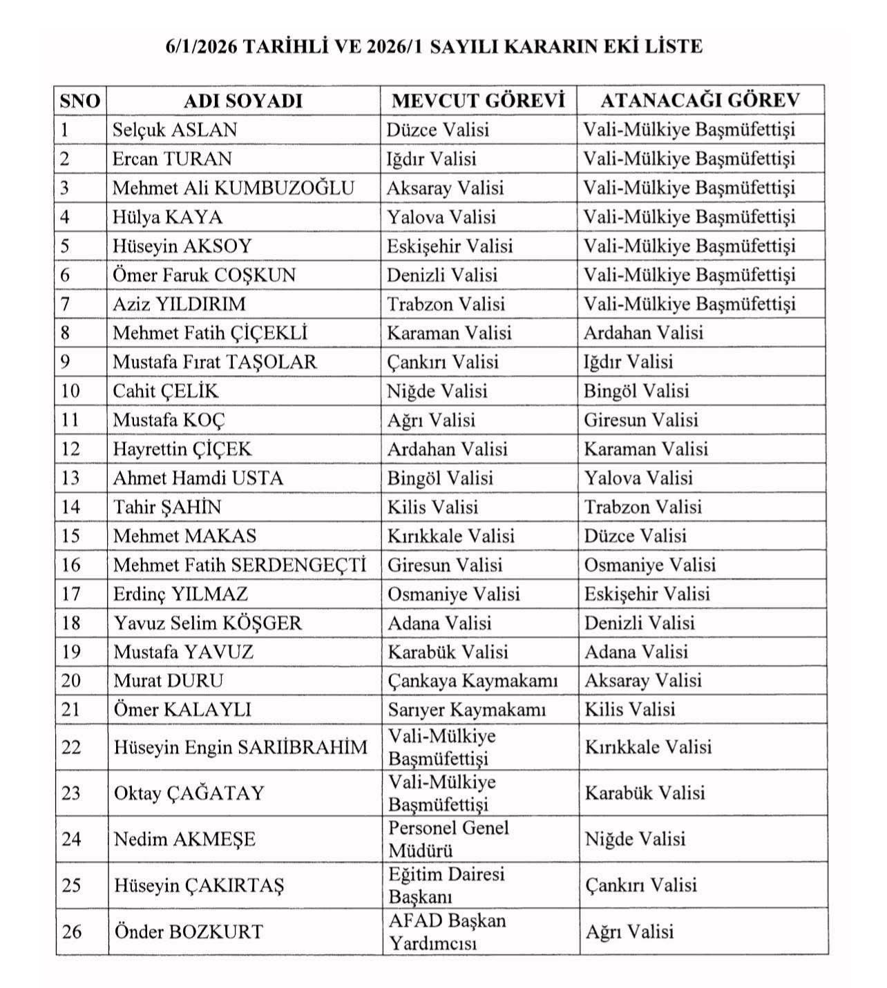 Cumhurbaşkanı Recep Tayyip Erdoğan'ın onayıyla hazırlanan Valiler Kararnamesi Resmi Gazete'de yayımlanarak resmen yürürlüğe girdi. Yayımlanan karar ile 7 vali merkeze çekilirken, 19 valilikte görev değişikliği yapıldı. Gaziantep'in yakından tanıdığı başarılı iki isimden biri Trabzon'a diğeri ise Kilis'e Vali olarak atandı.