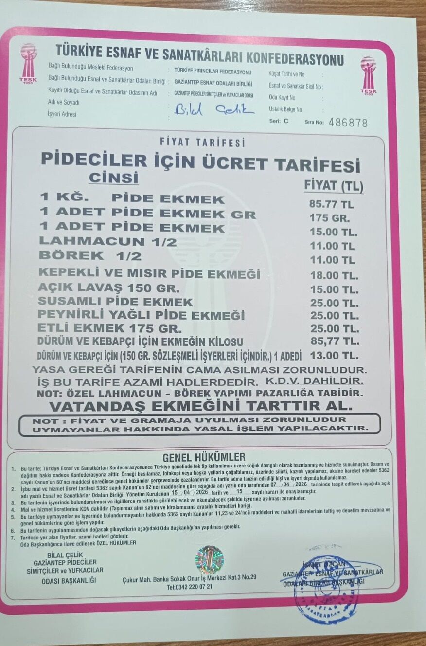 Bugünden geçerli olan yeni tarife ile birlikte 1 kilogram pide ekmeğin fiyatı 85 lira 77 kuruşa yükseldi. 175 gram ağırlığında olan pide ekmek 15 TL, lahmacun 11 TL, börek 11 TL, kepekli ve mısır ekmeği 18 TL, açık lavaş 15 TL, Peynirli Yağlı Ekmek 25 TL, Susamlı Pide Ekmeği 25 TL, Etli Ekmek 25 TL, Dürüm ve Kebapçılar için ekmek 13 TL olarak belirlendi.