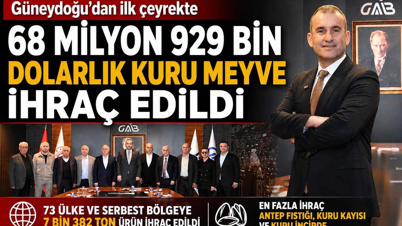 GAİB Hizmet binasında gerçekleştirilen toplantı sonrası bir değerlendirme yapan Güneydoğu Anadolu Kuru Meyve ve Mamulleri İhracatçıları Birliği Başkanı Murat Bakır “Güneydoğu Anadolu'nun yılın ilk çeyreğinde kuru meyve ve mamulleri sektörünün ihracat geliri 404 milyon 460 bin dolar oldu. 2026 yılının ilk çeyreği olan ocak-mart döneminde 73 ülke ve serbest bölgeye 7 bin 382 ton ürün gönderildi. Antep fıstığı, kuru kayısı, kuru incir, ceviz gibi ürünlerin üst sıralarda yer aldığı bu dönemde 68 milyon 929 bin dolar gelir elde edildi. Ürün bazlı ihracatta 25 milyon 467 bin dolarla Antep fıstığı, 20 milyon 775 bin dolarlık kuru kaysı ve 9 milyon 276 bin dolarlık kuru incir ihracatı yapıldı. Don ve kuraklık olaylarının üretimini etkilediği Antep fıstığı ihracatında miktar bazında yüzde 60,4, kuru kayısıda ise yüzde 71,6'lık düşüş yaşandı. En çok artış ceviz ihracatında yaşandı. Yüzde 198,9 'luk artış gösteren cevizi, yüzde 35,2'lik artış ile kuru incir takip etti. En çok talep Avrupa ülkelerinden gelirken, bu ülkelere 39 milyon 127 bin dolarlık ürün satıldı. Zirvede yer alan Almanya'ya 14 milyon 749 bin dolar, İtalya'ya 9 milyon 599 bin dolar, Fransa'ya 5 bin 37 bin dolarlık ihracat gerçekleştirildi” dedi.