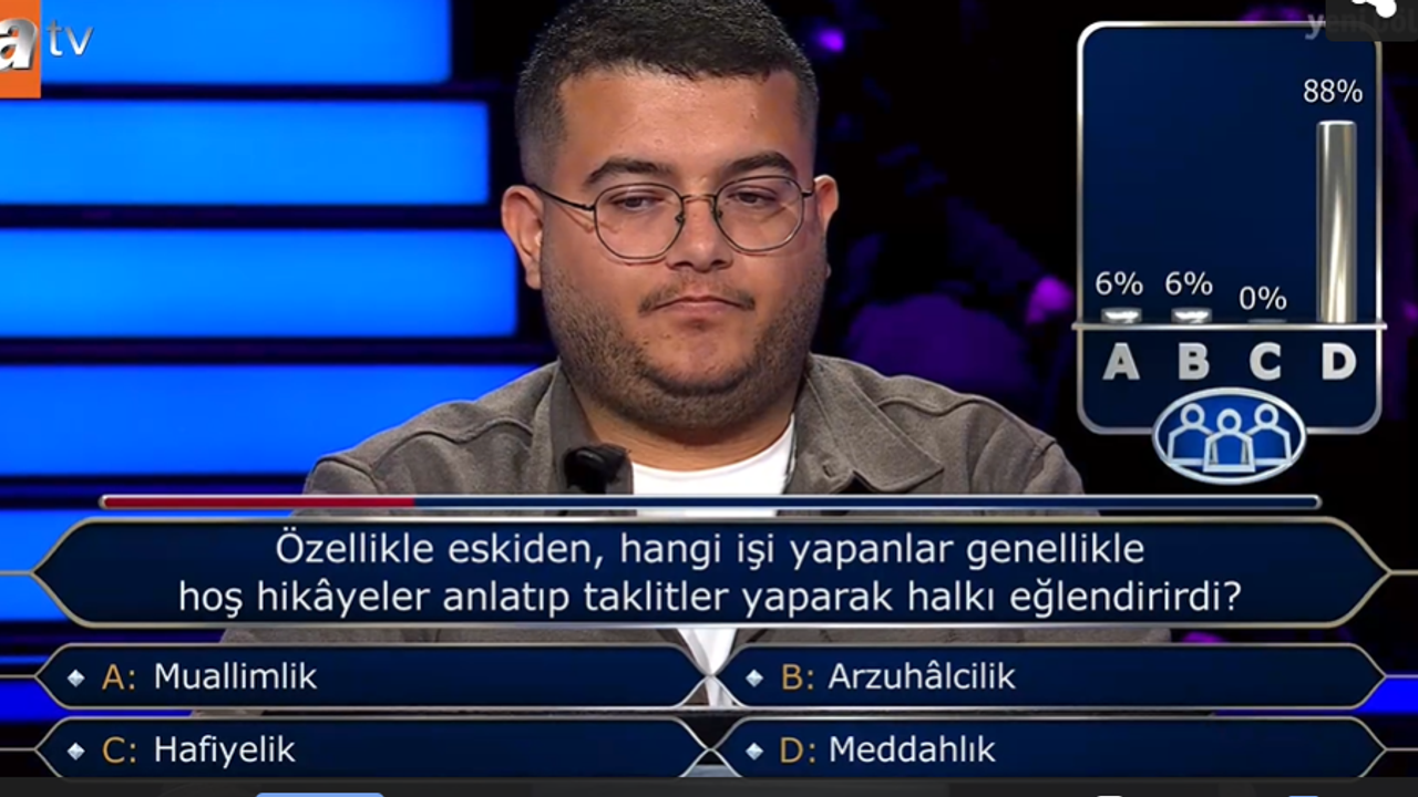 Hoş hikâyeler anlatıp taklit yaparak halkı eğlendiren meslek hangisidir, meddahlık nedir, meddah ne iş yapar, Kim Milyoner Olmak İster meddahlık sorusu cevabı ne oldu soruları, ATV ekranlarında yayınlanan yarışmanın ardından arama motorlarında en çok araştırılan başlıklar arasına girdi. Osmanlı’dan günümüze uzanan geleneksel bir sahne sanatını işaret eden soru, kültür tarihine dair önemli bir detayı gündeme taşıdı.