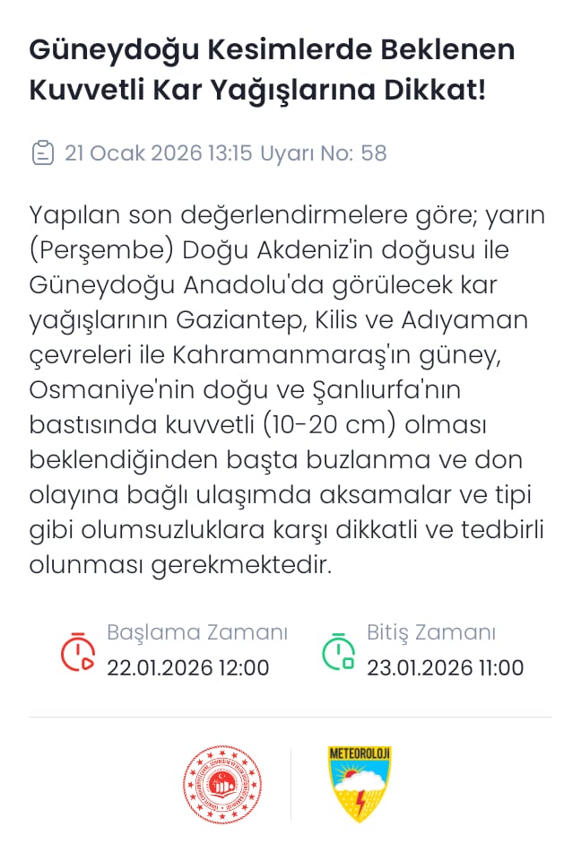 Meteoroloji Genel Müdürlüğünden yapılan açıklamada, “Yapılan son değerlendirmelere göre yarın(Perşembe) Doğu Akdeniz’in doğusu ile Güneydoğu Anadolu’da görülecek kart yağışlarının Gaziantep, Kilis ve Adıyaman çevreleri ile Kahramanmaraş’ın güney, Osmaniye’nin doğu ve Şanlıurfa’nın batısında kuvvetli (10-20 cm) olması beklendiğinden başta buzlanma ve don olayına bağlı ulaşımda aksamalar ve tipi gibi olumsuzluklara karşı dikkatli ve tedbirli olunması gerekmektedir” ifadeleri yer aldı.