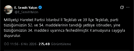 Söz konusu kararı MHP Genel Başkan Yardımcısı Edip Semih Yalçın duyurdu. Sosyal medya hesabı üzerinden açıklamalarda bulunan Yalçın, “Milliyetçi Hareket Partisi İstanbul İl Teşkilatı ve 39 İlçe Teşkilatı, parti tüzüğümüzün 52. ve 54. maddelerinin tanıdığı yetkiye istinaden, yine tüzüğümüzün 34. maddesi uyarınca feshedilmiştir. Kamuoyuna saygıyla duyurulur” ifadelerine yer verdi.