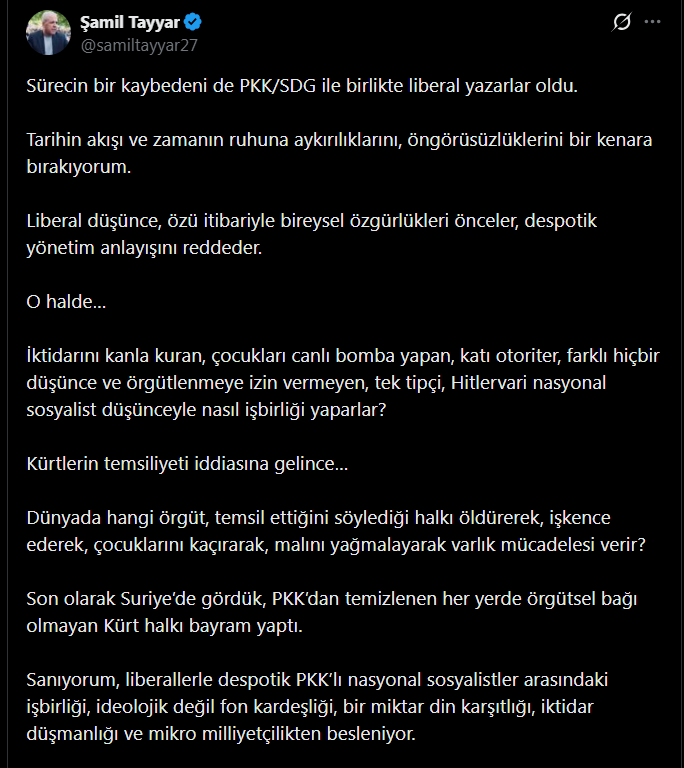 Kürtlerin temsiliyeti iddiasına değinen Tayyar, “Dünyada hangi örgüt, temsil ettiğini söylediği halkı öldürerek, işkence ederek, çocuklarını kaçırarak, malını yağmalayarak varlık mücadelesi verir? Son olarak Suriye’de gördük, PKK’dan temizlenen her yerde örgütsel bağı olmayan Kürt halkı bayram yaptı. Sanıyorum, liberallerle despotik PKK’lı nasyonal sosyalistler arasındaki işbirliği, ideolojik değil fon kardeşliği, bir miktar din karşıtlığı, iktidar düşmanlığı ve mikro milliyetçilikten besleniyor. Yani… Hiçbirinin maskelerine çizdikleri Kürtlerle bir meseleleri yok. Ama Kürtlerin terör örgütleriyle de bu fondaşlarla da meseleleri var. Onlara rağmen bu kardeşlik hem Türkiye’de hem Suriye’de tesis edilecek İnşallah” ifadelerini kullandı.