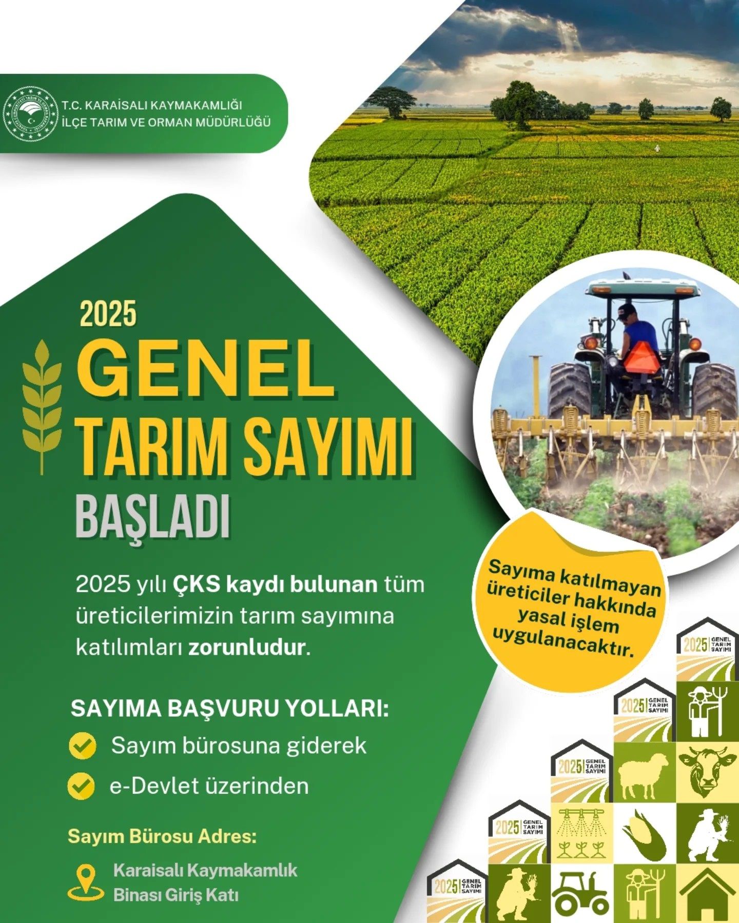 Türkiye İstatistik Kurumu (TÜİK) ile Tarım ve Orman Bakanlığının koordineli olarak yürüttüğü Genel Tarım Sayımı 31 Aralık’ta sona erecek. Üreticilerin 124 numaralı hattan gelen çağrıya cevap vermeleri, ilçe tarım sayım büroları ya da E- devlet üzerinden sayıma başvurmaları zorunlu.